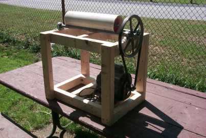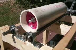 Start by filling the bottle with cut copper wire (copper shot) to about three-quarters full. You want enough copper to clean the inside of the neck, but too much will clog the tumbling action. I add about a teaspoonful of aluminum oxide powder as the polishing compound then fill the bottle with water to just above the shot. Place the bottle inside the cylinder and fill the tube with more copper shot, aluminum oxide and water. Again, you must eyeball the quantities to insure that the mixture outside the bottle will get plenty of tumbling action and that all of the bottles surface will be in contact with the copper as it is turned. When you have sealed the container, place it on your machine and let it turn at about 30 - 60rpm for four days to a week, depending on how heavily the bottle was stained. Be sure to reverse the rotation half-way through. |