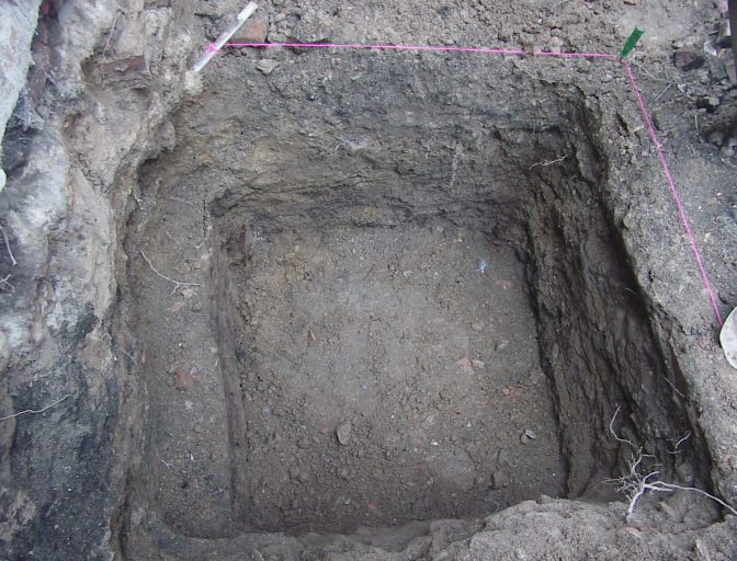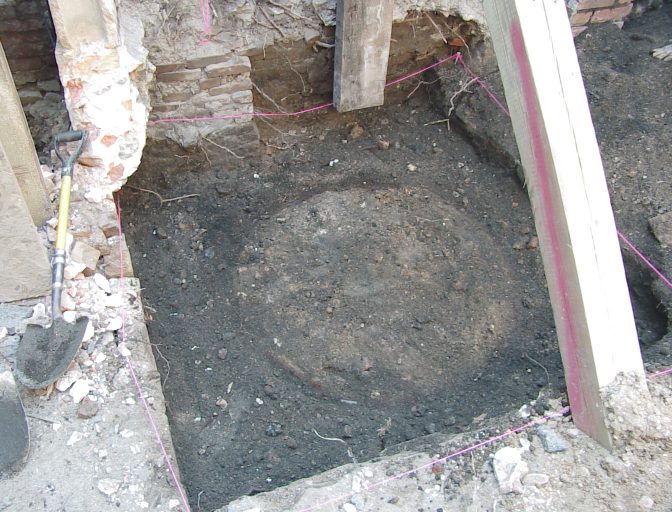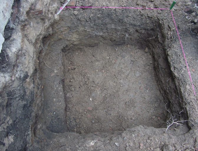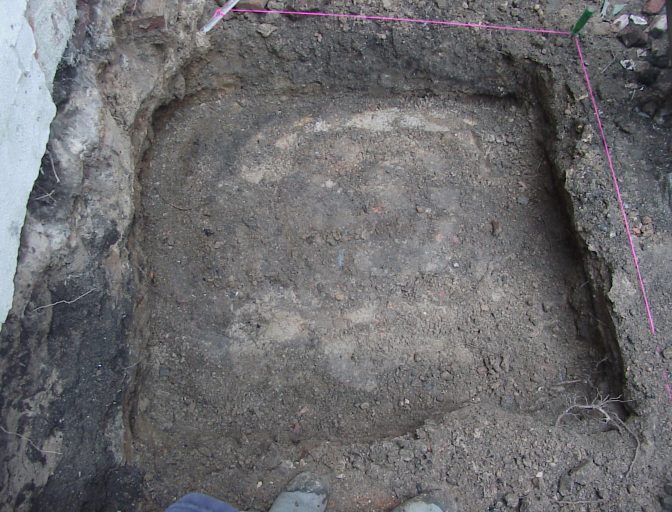 End of day one. The next morning we got started on the square brick feature. This turned out to be some kind of foundation to what we believe was an early unattached kitchen that mite possible have gone to the Robert Long house next door.