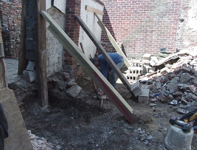 Well so permission Gained and some research done its time to dig. we started on a Wednesday morning it was sunny and a bit warm but nice weather to dig in. We walked into the back courtyard and the contractor that was doing the renovations on the buildings had dug out the top foot of fill in the court yard and also had been storing a huge pile of bricks and a huge mound of debris back there. this wasn't going to be easy. There was also a cinderblock wall that was being propped up by a few large boards it was right in the area we wanted to dig in.
