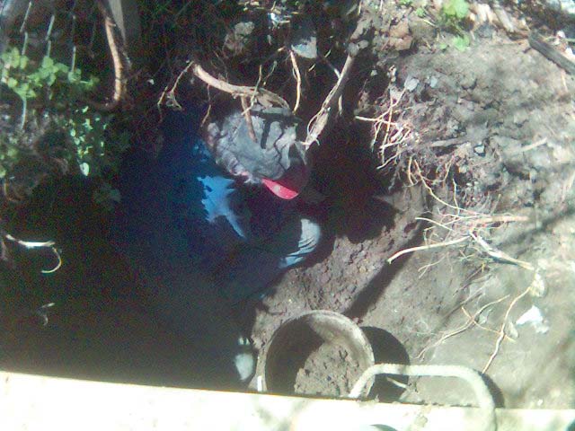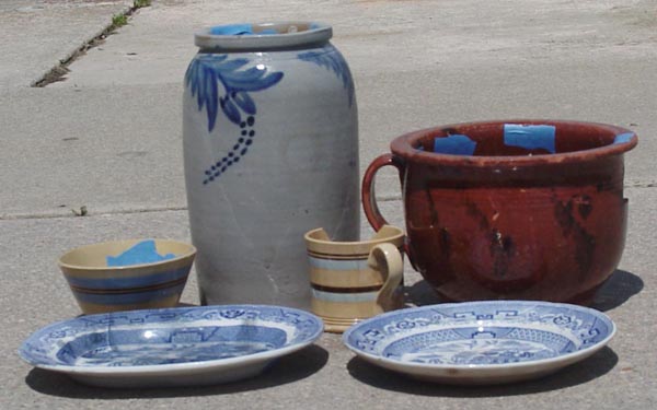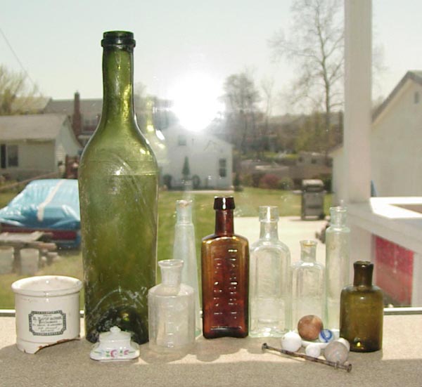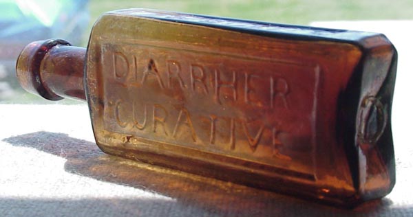 Well today started off by me and Doug meeting downtown at the normal time and place. Today it was just the two of us since no one else called me wanting to dig with us. We had a pit in mind that we had seen the previous week but didn't have time to dig it. So we wasted no time and headed straight for that pit. we arrived and found everything exactly as it was the week before. and we started digging where I had probed out a brickliner behind this 1830s house. The pit turned out to be a large round brickliner about 5 foot across and ended up going about 10 feet deep. The fill was very ashy and the top 5 feet was loaded with broken machine made crown top beers and other 1915 era crap. As we went down the age stayed pretty much the same. Then Doug hit water in the pit at about 5 feet deep while digging a sump hole to bail out the water he pulled out a few pieces of early slip decorated yellowware. This was a good sign of the things to come. I was hoping this pit would get old and by about 6 feet the ash had given way to a rich loamy layer laden with artifacts from the 1860s this soon gave way to 1850s artifacts with pontiled puffs coming out left and right. I said to Doug damn where are the embossed bottles. Just after that he said wait here's one as he uncovered a small rectangular pontiled medicine. I immediately recognized it as one of the J. W. Bulls meds due to its distinctive shape. Doug wiped off the one side and said your right its a Bulls and he handed it up to me. As soon as I had it in my hand I wiped it off the rest of the way to see which one of his products it was. To my surprise it was his Diarrhoea Curative (misspelled of course) and it was amber. I was expecting one of his other products as there is only one other intact example of this bottle know. I quickly took this one to the truck for safe keeping. then returned, as we continued taking this pit down more bottles came to light. Including a pontiled Sapphire blue cologne and an aqua pontiled Baltimore druggists. Then a few Baltimore historical flasks in olive green and amber both pontiled but both sadly broken. Then some more puff and tons of early pottery shards which we were picking out to glue back together later. Then finally a green pontiled ink right on bottom.
